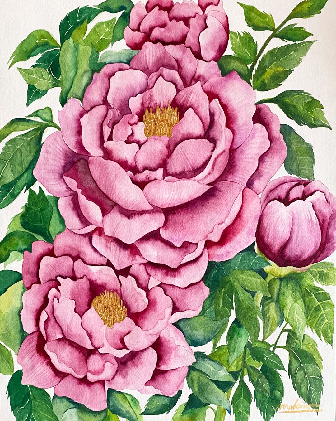 この作品は、華やかに咲いた芍薬の花を描いたものです。